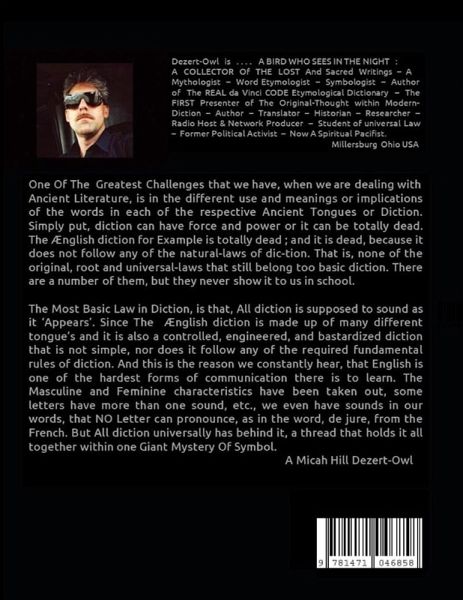 AN ETYMOLOGICAL CLASSIC SOURCE DICTIONARY THESAURUS One Of The Greatest Challenges that we have, when we are dealing with Ancient Literature, is in the different use and meanings or implications of the words in each of the respective Ancient Tongues or Diction. Simply put, diction can have force and power or it can be totally dead. The Ænglish diction for Example is totally dead ; and it is dead, because it does not follow any of the natural-laws of dic-tion. That is, none of the original, root and universal-laws that still belong too basic diction. There are a number of them, but they never show it to us in school. The Most Basic Law in Diction, is that, All diction is supposed to sound as it 'Appears'. Since The Ænglish diction is made up of many different tongue's and it is also a controlled, engineered, and bastardized diction that is not simple, nor does it follow any of the required fundamental rules of diction. And this is the reason we constantly hear, that English is one of the hardest forms of communication there is too learn. The Masculine and Feminine characteristics have been taken out, some letters have more than one sound, etc., we even have sounds in our words, that NO Letter can pronounce, as in the word, de jure, from the French. But All diction universally has behind it, a thread that holds it all together within one Giant Mystery and it is The Mystery Of Symbol. - A Micah Hill Dezert-Owl