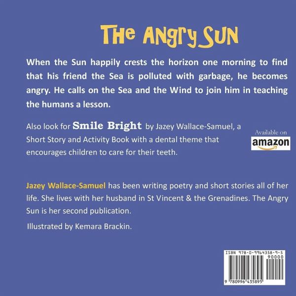 When the Sun happily crests the horizon one morning to find that his friend the Sea is polluted with garbage, he becomes angry. He calls on the Sea and the Wind to join him in teaching the humans a lesson. Also look for Smile Bright by Jazey Wallace-Samuel, a Short Story and Activity Book with a dental theme that encourages children to care for their teeth. Jazey Wallace-Samuel has been writing poetry and short stories all of her life. She lives with her husband in St Vincent & the Grenadines. The Angry Sun is her second publication. Illustrated by Kemara Brackin.