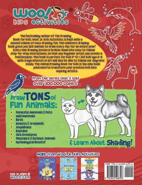 A Children's Drawing Book for Young Animal Lovers This step by step drawing guide is essential for all kids! As the next book in the bestselling drawing series that began with The Drawing Book for Kids by Woo! Jr. Kids Activities, this children’s drawing book gives your kids 365 animals to draw every day for an entire year. How to draw animals made easy. If your kids are fascinated by art and sketching, this book provides drawing lessons in book form. Sometimes drawing animals can be tricky, but this guide makes children’s drawing fun and accessible to all. Whether you’re looking for gifts for girls who want to learn how to draw cute baby animals, or boys who love to sketch wild animals, this book makes the perfect present for both. The Animal Drawing Book for Kids is the only book you need to transform your creative kids into aspiring artists. Learn about very cute animals and drawing at the same time. In The Animal Drawing Book for Kids, children will encounter their favorite animals as well as ones they may never have heard of. They will be entertained with cute animals to draw while expanding their knowledge of the animal kingdom. Every activity offers mini lessons in step-by-step drawing kids are sure to enjoy, so that all budding artists can create a masterpiece. Inside, children will find easy drawing ideas, step-by-step instructions, and a fascinating menagerie of animals like: Beloved pets like dogs, cats, horses, and fish Awesome sea animals like turtles, manatees, and seahorses, and sharks Owls, eagles, flamingos and other interesting birds Mythological animals such as the sphinx, unicorn, and dragon Cool dinosaurs, extinct animals, cute creatures, and more! If you’re looking for easy drawing books or instructions on how to draw cute animals for kids 9-12-like How to Draw Cute Animals or How to Draw Animals for Kids—you’ll love The Animal Drawing Book for Kids.