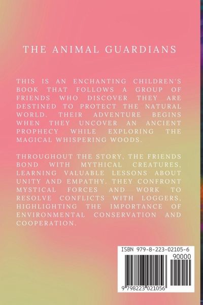 The Animal Guardians is an enchanting children's book that follows a group of friends who discover they are destined to protect the natural world. Their adventure begins when they uncover an ancient prophecy while exploring the magical Whispering Woods. Throughout the story, the friends bond with mythical creatures, learning valuable lessons about unity and empathy. They confront mystical forces and work to resolve conflicts with loggers, highlighting the importance of environmental conservation and cooperation. In essence, "The Animal Guardians" is an engaging tale that combines adventure, friendship, and environmental awareness, making it an entertaining and educational read for children.