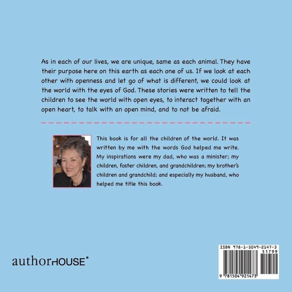 As in each of our lives, we are unique, same as each animal. They have their purpose here on this earth as each one of us. If we look at each other with openness and let go of what is different, we could look at the world with the eyes of God. These stories were written to tell the children to see the world with open eyes, to interact together with an open heart, to talk with an open mind, and to not be afraid.
