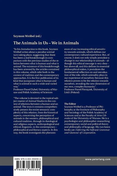 «The volume is devoted to the topical subject matter of Animal Studies in the context of relations between a human and an animal. The texts it contains comprehensively present the entire semantic complexity of this relation, from the historical aspects, concerning the perception of animals in the western, philosophical and cultural tradition, through its theological and religious aspects, anthropological and ethical, linguistic, to the contemporary - philosophical and literary aspects. In this way, the book investigates the phenomenon of our increasing ethical sensitivity towards animals, which defines our contemporary cultural experience. But, of course, it does not only simply postulate a change in our relationship to animals - although this ethical message is very clear - but above all, and this defines its essential philosophical stakes, it postulates the fundamental reflection on and reevaluation of the role, which animality plays in our experience of ourselves: because this relation proves to be the relation towards ourselves, revealing the new dimension of our own, complex humanity». (Professor Pawel Pieniazek, University of Lódz (Poland))