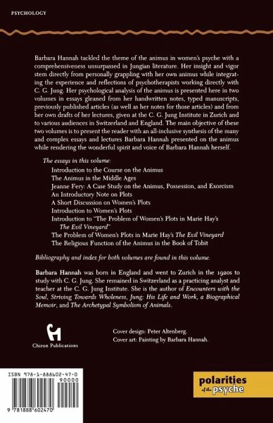 Barbara Hannah was a straightforward, modest, yet grand woman, a lover of literature and a colleague and friend of C. G. Jung, Emma Jung, and Marie-Louise von Franz. A first-generation Jungian psychologist, she was one of the original members of the Psychological Club of Zurich and one of the founders of the Jung Institute in Zurich. She lectured extensively in Switzerland and England and wrote several books on C. G. Jung and Jungian psychology. These two volumes present her psychological analysis of the animus gleaned from handwritten notes, typed manuscripts, previously published articles, her own drafts of her lectures, and notes taken by those present. She tackled the theme of the animus with a comprehensiveness unsurpassed in Jungian literature. Her insight and vigor stem from a personal grappling with her own animus while integrating the experience and reflections of many psychotherapists who were working directly with C. G. Jung. Authenticity and comprehensiveness were priorities in editing this work as well as preserving the excellence and comprehensiveness of her work on the animus-a most complex and vexing topic-while rendering the wonderful natural spirit of Barbara Hannah herself. Themes include the case of the sixteenth-century nun, Jeanne Fery, the animus in the Book of Tobit, literature generally and the Brontës in particular, and the meaning of the animus for modern women. Volume 2 is the second volume in this two volume set and both are part of the "Polarities of the Psyche" series; the first two books in the series are lectures on Jung's "Aion and The Archetypal Symbolism of Animals." Barbara Hannah (1891-1986) was born in England. She went to Zurich in 1929 to study with Carl Jung and lived in Switzerland the rest of her life. A close associate of Jung until his death, she was a practicing psychotherapist and lecturer at the C.G. Jung Institute. Her books available from Chiron include The Archetypal Symbolism of Animals; Encounters with the Soul; Jung, His Life and Work: A Biographical Memoir; and Striving Toward Wholeness.