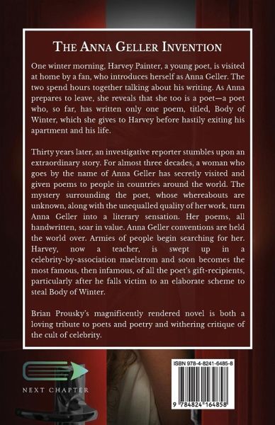 One winter morning, Harvey Painter, a young poet, is visited at home by a fan, who introduces herself as Anna Geller. The two spend hours together talking about his writing. As Anna prepares to leave, she reveals that she too is a poet-a poet who, so far, has written only one poem, titled, Body of Winter, which she gives to Harvey before hastily exiting his apartment and his life. Thirty years later, an investigative reporter stumbles upon an extraordinary story. For almost three decades, a woman who goes by the name of Anna Geller has secretly visited and given poems to people in countries around the world. The mystery surrounding the poet, whose whereabouts are unknown, along with the unequalled quality of her work, turn Anna Geller into a literary sensation. Her poems, all handwritten, soar in value. Anna Geller conventions are held the world over. Armies of people begin searching for her. Harvey, now a teacher, is swept up in a celebrity-by-association maelstrom and soon becomes the most famous, then infamous, of all the poet's gift-recipients, particularly after he falls victim to an elaborate scheme to steal Body of Winter. Brian Prousky's magnificently rendered novel is both a loving tribute to poets and poetry and withering critique of the cult of celebrity.