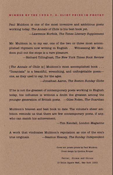 The Annals of Chile, Paul Muldoon's first book of new poetry since the acclaimed Madoc: A Mystery (1991), confirms the widely held view that he is the most talented poet of his generation. The heart of the book is the long poem "Yarrow", in which all Muldoon's powers of insight and wordplay and surprising association are on exuberant display. Evoking the 1960s, the poet conjures up a boundless historical present peopled at once by Davy Crockett and Tristan Tzara and Wild Bill Hickok, by Maud Gonne and Michael Jackson, all brought swiftly and vividly to life by his fantastical imagination. The book also contains a group of shorter poems, including "The Birth", a delicate lyric which celebrates the arrival of a baby daughter; "Incantata", a powerful elegy to a former lover; and Muldoon's inspired adaptation of an episode from Ovid's Metamorphoses. Art, Muldoon writes, "builds from pain, from misery, from a deep-seated hurt / a monument to the human heart"; and here, out of strong emotion, in memorable language, Muldoon has once again fashioned rich and vital poetry.