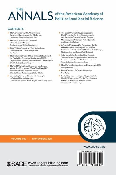This volume of The ANNALS aims to increase awareness of child welfare services in the United States and promote understanding of the broad impacts of related policies. Its articles present concrete recommendations for better preventing, identifying, and addressing child maltreatment.