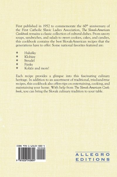 First published in 1952 to commemorate the 60th anniversary of the First Catholic Slavic Ladies Association, The Slovak-American Cookbook remains a classic collection of cultural dishes. From savory soups, sandwiches, and salads to sweet cookies, cakes, and candies, this cookbook contains the best Slovak-American recipes that the generations have to offer. Some national favorites featured are: Halusky Klobasy Strudel Fanky Kolace and more!