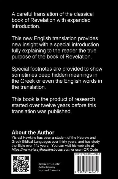 A careful translation of the classical book of Revelation with expanded introduction. This new English translation provides new insight with a special introduction fully explaining to the reader the true purpose of the book of Revelation. Special footnotes are provided to show sometimes deep hidden meanings in the Greek or even the English words in the translation. This book is the product of research started over twelve years before this translation was published.