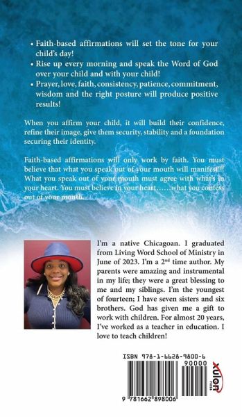 - Faith-based affirmations will set the tone for your child's day! - Rise up every morning and speak the Word of God over your child and with your child! - Prayer, love, faith, consistency, patience, commitment, wisdom and the right posture will produce positive results! When you affirm your child, it will build their confidence, refine their image, give them security, stability and a foundation securing their identity. Faith-based affirmations will only work by faith. You must believe that what you speak out of your mouth will manifest!!! What you speak out of your mouth must agree with what's in your heart. You must believe in your heart......what you confess out of your mouth. I'm a native Chicagoan. I graduated from Living Word School of Ministry in June of 2023. I'm a 2nd time author. My parents were amazing and instrumental in my life; they were a great blessing to me and my siblings. I'm the youngest of fourteen; I have seven sisters and six brothers. God has given me a gift to work with children. For almost 20 years, I've worked as a teacher in education. I love to teach children!