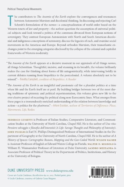 The contributors to The Anomie of the Earth explore the convergences and resonances between Autonomist Marxism and decolonial thinking. In discussing and rejecting Carl Schmitt's formulation of the nomos-a conceptualization of world order based on the Western tenets of law and property-the authors question the assumption of universal political subjects and look towards politics of the commons divorced from European notions of sovereignty. They contrast European Autonomism with North and South American decolonial and indigenous conceptions of autonomy, discuss the legacies of each, and examine social movements in the Americas and Europe. Beyond orthodox Marxism, their transatlantic exchanges point to the emerging categories disclosed by the collapse of the colonial and capitalist frameworks of Western modernity. Contributors. Joost de Bloois, Jodi A. Byrd, Gustavo Esteva, Silvia Federici, Wilson Kaiser, Mara Kaufman, Frans-Willem Korsten, Federico Luisetti, Sandro Mezzadra, Walter D. Mignolo, Benjamin Noys, John Pickles, Alvaro Reyes, Catherine Walsh, Gareth Williams, Zac Zimmer