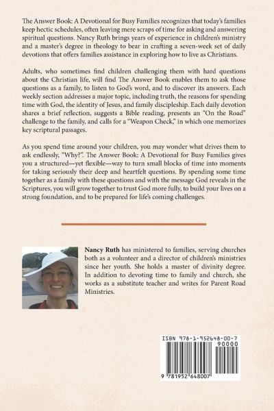 The Answer Book: A Devotional for Busy Families recognizes that today's families keep hectic schedules, often leaving mere scraps of time for asking and answering spiritual questions. Nancy Ruth brings years of experience in children's ministry and a master's degree in theology to bear in crafting a seven-week set of daily devotions that offers families assistance in exploring how to live as Christians. Adults, who sometimes find children challenging them with hard questions about the Christian life, will find The Answer Book enables them to ask those questions as a family, to listen to God's word, and to discover its answers. Each weekly section addresses a major topic, including truth, the reasons for spending time with God, the identity of Jesus, and family discipleship. Each daily devotion shares a brief reflection, suggests a Bible reading, presents an "On the Road" challenge to the family, and calls for a "Weapon Check," in which one memorizes key scriptural passages. As you spend time around your children, you may wonder what drives them to ask endlessly, "Why?". The Answer Book: A Devotional for Busy Families gives you a structured-yet flexible-way to turn small blocks of time into moments for taking seriously their deep and heartfelt questions. By spending some time together as a family with these questions and with the message God reveals in the Scriptures, you will grow together to trust God more fully, to build your lives on a strong foundation, and to be prepared for life's coming challenges.