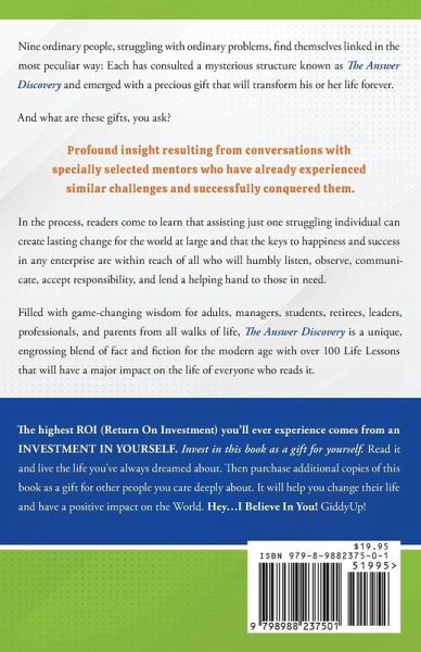 Nine ordinary people, struggling with ordinary problems, find themselves linked in the most peculiar way: Each has consulted a mysterious structure known as The Answer Discovery and emerged with a precious gift that will transform his or her life forever. And what are these gifts, you ask? Profound insight resulting from conversations with specially selected mentors who have already experienced similar challenges and successfully conquered them. In the process, readers come to learn that assisting just one struggling individual can create lasting change for the world at large and that the keys to happiness and success in any enterprise are within reach of all who will humbly listen, observe, communicate, accept responsibility, and lend a helping hand to those in need. Filled with game-changing wisdom for adults, managers, students, retirees, leaders, professionals, and parents from all walks of life, The Answer Discovery is a unique, engrossing blend of fact and fiction for the modern age with over 100 Life Lessons that will have a major impact on the life of everyone who reads it. The highest ROI (Return On Investment) you'll ever experience comes from an INVESTMENT IN YOURSELF. Invest in this book as a gift for yourself. Read it and live the life you've always dreamed about. Then purchase additional copies of this book as a gift for other people you care deeply about. It will help you change their life and have a positive impact on the World. Hey...I Believe In You! GiddyUp!