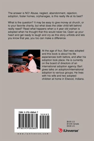 The Answer is No! Abuse, neglect, abandonment, rejection, adoption, foster homes, orphanages. Is this really life at its best? What is the question? It may be easy to give money at church, or to your favorite charity, but what does the older child really need? Read what happens when a four-year-old orphan is adopted. Open your heart and get ready to laugh and cry as this story unfolds. This book allows readers to understand that "Yes," you too, can make a difference.