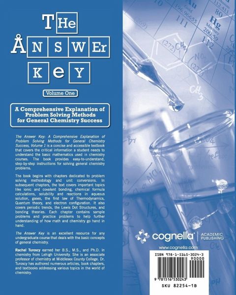 The Answer Key: A Comprehensive Explanation of Problem Solving Methods for General Chemistry Success, Volume 1 is a concise and accessible textbook that covers the critical information a student needs to understand the basic mathematics used in chemistry courses. The book provides easy-to-understand, step-by-step instructions for solving general chemistry problems. The book begins with chapters dedicated to problem solving methodology and unit conversions. In subsequent chapters, the text covers important topics like ionic and covalent bonding, chemical formula calculations, solubility and reactions in aqueous solution, gases, the first law of Thermodynamics, Quantum theory, and electron configuration. It also covers periodic trends, the Lewis Dot Structures, and bonding theories. Each chapter contains sample problems and practice problems to help further understanding of how math and chemistry go hand in hand. The Answer Key is an excellent resource for any undergraduate course that deals with the basic concepts of general chemistry. Rachel Turoscy earned her B.S., M.S., and Ph.D. in chemistry from Lehigh University. She is an associate professor of chemistry at Middlesex County College. Dr. Turoscy has authored numerous articles, book chapters, and textbooks addressing various topics in the world of chemistry.