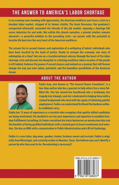 In an economy once teeming with opportunity, the American workforce now faces a crisis in a desolate labor market, stripped of its former vitality. The Great Recession, the pandemic's unexpected aftermath, unraveled the threads of the job market, exposing a shortage felt across industries far and wide. But within this chaotic narrative, a pivotal solution remains obscured-a powerful antidote to the prevailing crisis-an answer with the potential to breathe life back into the very heart of the American workforce. The answer lies in second chances and exploration of a wellspring of talent: individuals who have been touched by the hand of justice. Ready to reshape the economy, one story of redemption at a time? Join me on a transformational odyssey through the heart of the labor shortage crisis and discover the blueprint to a thriving workforce where no piece of the puzzle is left behind. Embrace the power of second chances and embark on a journey that will forever change the way you view talent, potential, and the boundless possibilities of the American dream.