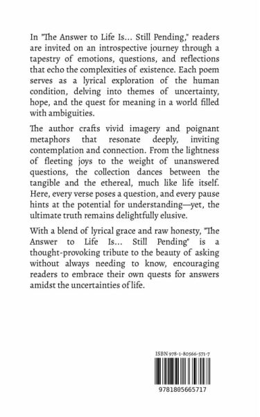 In "The Answer to Life Is... Still Pending," readers are invited on an introspective journey through a tapestry of emotions, questions, and reflections that echo the complexities of existence. Each poem serves as a lyrical exploration of the human condition, delving into themes of uncertainty, hope, and the quest for meaning in a world filled with ambiguities. The author crafts vivid imagery and poignant metaphors that resonate deeply, inviting contemplation and connection. From the lightness of fleeting joys to the weight of unanswered questions, the collection dances between the tangible and the ethereal, much like life itself. Here, every verse poses a question, and every pause hints at the potential for understanding-yet, the ultimate truth remains delightfully elusive. With a blend of lyrical grace and raw honesty, "The Answer to Life Is... Still Pending" is a thought-provoking tribute to the beauty of asking without always needing to know, encouraging readers to embrace their own quests for answers amidst the uncertainties of life.