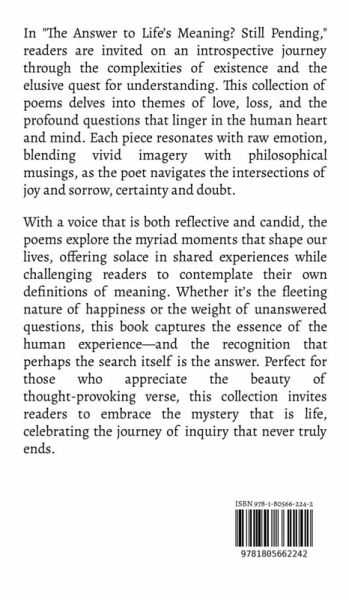 In "The Answer to Life's Meaning? Still Pending," readers are invited on an introspective journey through the complexities of existence and the elusive quest for understanding. This collection of poems delves into themes of love, loss, and the profound questions that linger in the human heart and mind. Each piece resonates with raw emotion, blending vivid imagery with philosophical musings, as the poet navigates the intersections of joy and sorrow, certainty and doubt. With a voice that is both reflective and candid, the poems explore the myriad moments that shape our lives, offering solace in shared experiences while challenging readers to contemplate their own definitions of meaning. Whether it's the fleeting nature of happiness or the weight of unanswered questions, this book captures the essence of the human experience-and the recognition that perhaps the search itself is the answer. Perfect for those who appreciate the beauty of thought-provoking verse, this collection invites readers to embrace the mystery that is life, celebrating the journey of inquiry that never truly ends.