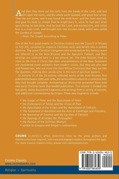 One of the first great events in Christian history was the Council of Nicaea in 325 AD, convened to organize Christian sects and beliefs into a unified doctrine. The great Christian clergymen who wrote before this famous event are referred to as the Ante-Nicenes and the Apostolic Fathers, and their writings are collected here in a ten-volume set. The Ante-Nicenes lived so close to the time of Christ that their interpretations of the New Testament are considered more authentic than modern voices. But they are also real and flawed men, who are more like their fellow Christians than they are like the Apostles, making their words echo in the ears of spiritual seekers. In Volume IX of the 10-volume collected works of the Ante-Nicenes first published between 1885 and 1896, the series editors return to a collection that they had thought complete. Archaeological discoveries presented them with new early Christian texts that needed publication. This volume is divided into two parts: newly discovered fragments and writings from a variety of sources, and additional commentaries by Origen. These new fragments include: . the Gospel of Peter and the Apocalypse of Peter . the Diatessaron of Tatian and the Vision of Paul . the Apocalypse of the Virgin and the Apocalypse of Sedrach . The Testament of Abraham and the Acts of Xanthippe and Polyxena . the Narrative of Zosimus and the Epistles of Clement . the Apology of Aristides the Philosopher . the Passion of the Scillitan Martyrs . epistle to Gregory and Origen's commentary