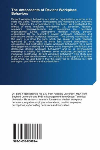 Deviant workplace behaviors are vital for organizations in terms of its costs and gains. Therefore, investigating and managing such behaviors is an obligation for organizations. In this book, we investigated the effects of some employee orientations (i.e. careerism, idealism, relativism, machiavellianism) and perceptions (i.e. perceived organizational justice, participative decision making, person-organization fit) on destructive deviant workplace behaviors and constructive deviant workplace behaviors. The primary contribution of this study is to close the gaps, which give answer to such research questions (a) what might be some less studied antecedents of constructive and destructive deviant workplace behaviors? (b) is moral disengagement a missing link between some employee orientations and destructive deviant workplace behaviors? and (c) is psychological ownership a missing link between some employee perceptions and innovative constructive deviant workplace behaviors? This study also provides a theoretical framework to constitute a starting point for further researches. We also believe that this study will be beneficial for HRM managers, practitioners and academicians