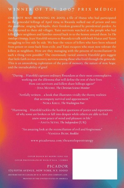 One hot May morning in 2003, a crowd of Hutus who had participated in the genocidal killings of April 1994 in Rwanda filed out of prison and into the sunshine, singing hallelujahs, their freedom granted by presidential pardon. As they returned to their old villages, Tutsi survivors watched as the people who had killed their neighbors and families returned to the homes around them. In The Antelope's Strategy, Jean Hatzfeld returns to Rwanda to talk with both Hutus and Tutsis struggling to live side by side. We hear the voices of killers who have been released from prison or returned from exile, and Tutsi escapees who must now tolerate them as neighbors. How are they managing with the process of reconciliation? Is such a thing even possible? The enormously varied answers Hatzfeld gets suggest that little faith in true recovery survives among those who lived through the genocide. This is an astonishing exploration of the pain of memory, the nature of stoic hope, and the ineradicability of grief.