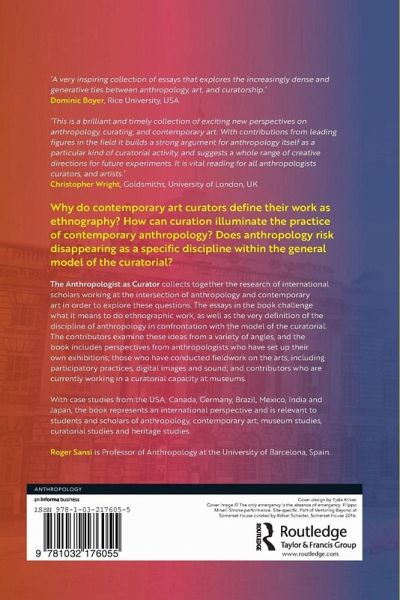 Why do contemporary art curators define their work as ethnography? How can curation illuminate the practice of contemporary anthropology? Does anthropology risk disappearing as a specific discipline within the general model of the curatorial? The Anthropologist as Curator collects together the research of international scholars working at the intersection of anthropology and contemporary art in order to explore these questions. The essays in the book challenge what it means to do ethnographic work, as well as the very definition of the discipline of anthropology in confrontation with the model of the curatorial. The contributors examine these ideas from a variety of angles, and the book includes perspectives from anthropologists who have set up their own exhibitions; those who have conducted fieldwork on the arts, including participatory practices, digital images and sound; and contributors who are currently working in a curatorial capacity at a museum.With case studies from the USA, Canada, Germany, Brazil, Mexico, India and Japan, the book represents an international perspective and is relevant to students and scholars of anthropology, contemporary art, museum studies, curatorial studies and heritage studies.