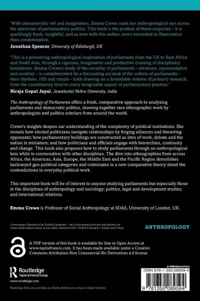 "This is a pioneering anthropological exploration of parliaments from the UK to East Africa and South Asia, through a rigorous, imaginative and productive crossing of disciplinary boundaries. Emma Crewe's study of the sociality of parliaments - elections, representation and scrutiny - is complemented by a fascinating account of the culture of parliaments - their rhythms, riffs and rituals - both drawing on a formidable volume of primary research, from the constituency level to every imaginable aspect of parliamentary practice."