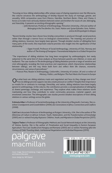 1. The Anthropology of Sibling Relations: Explorations in Shared Parentage, Experience, and Exchange; Tatjana Thelen, Cati Coe, and Erdmute Alber PART I: THE GIVEN AND THE MADE 2. "Sharing Made Us Sisters": Sisterhood, Migration and Household Dynamics in Mexico and Namibia; Julia Pauli 3. Kinship as Friendship: Brothers and Sisters in Kwahu, Ghana; Sjaak van der Geest PART II: AMBIVALENCE IN SIBLING RELATIONS ACROSS THE LIFE COURSE 4. Within the Thicket of Intergenerational Sibling Relations: A Case Study from Northern Benin; Erdmute Alber 5. When Siblings Determine Your Fate: Educational Mobility and Sibling Support in Rural Northwest China; Helena Obendiek 6. Transnational Migration and Changes in Sibling Support in Ghana; Cati Coe Afterword; Janet Carsten