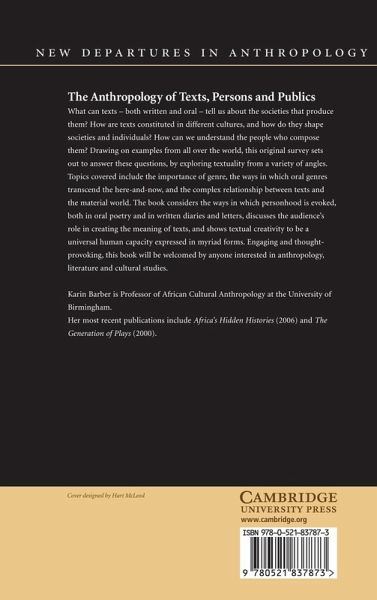 What can texts - both written and oral - tell us about the societies that produce them? How are texts constituted in different cultures, and how do they shape societies and individuals? How can we understand the people who compose them? Drawing on examples from Africa and other countries, this original study sets out to answer these questions, by exploring textuality from a variety of angles. Topics covered include the importance of gender, the ways in which oral genres transcend the here-and-now, and the complex relationship between texts and the material world. Barber considers the ways in which personhood is evoked, both in oral poetry and in written diaries and letters, discusses the audience's role in creating the meaning of texts, and shows textual creativity to be a universal human capacity expressed in myriad forms. Engaging and thought-provoking, this book will be welcomed by anyone interested in anthropology, literature and cultural studies.