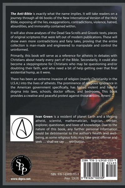 The Anti-Bible is exactly what the name implies. It will take readers on a journey through all 66 books of the New International Version of the Holy Bible, exposing all the lies, exaggerations, contradictions, violence, hatred, absurdities, and immorality contained within. It will also show analyses of the Dead Sea Scrolls and Gnostic texts, pieces of original scriptures that were left out of modern publications. These will show even more contradictions and fairy tales, proving that the entire collection is man-made and engineered to manipulate and control the uninformed. Primarily, this book will serve as a reference for atheists in debates with Christians about nearly every part of the Bible. Secondarily, it could also become a steppingstone for Christians who may be questioning and/or doubting their faith, and who need a bit of help getting over that final existential hump, as it were. There has been an extreme invasion of religion (mainly Christianity in the U.S.A.) into the lives of atheists. The prominence of religious ignorance in the American government specifically, has forced violent and hateful dogma into laws, schools, doctor offices, and bedrooms. This book provides a creative and peaceful protest against those actions. Amen! (About the Author) Ivan Green is a resident of planet Earth and a lifelong atheist, scientist, mathematician, logician, thinker, explorer, questioner, and lover of knowledge. Due to the nature of this book, any further personal information could be detrimental to the author's health and well-being, as some religious folks may take great offense and seek ... shall we say ... retribution.