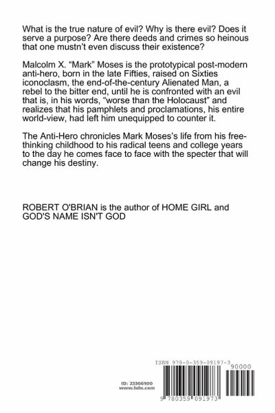 What is the true nature of evil? Why is there evil? Does it serve a purpose? Are there deeds and crimes so heinous that one mustn't even discuss their existence? Malcolm X. "Mark" Moses is the prototypical post-modern anti-hero, born in the late Fifties, raised on Sixties iconoclasm, the end-of-the-century Alienated Man, a rebel to the bitter end, until he is confronted with an evil that is, in his words, "worse than the Holocaust" and realizes that his pamphlets and proclamations, his entire world-view, had left him unequipped to counter it. The ANTI-HERO chronicles Mark Moses's life from his free-thinking childhood to his radical teens and college years to the day he comes face to face with the specter that will change his destiny.