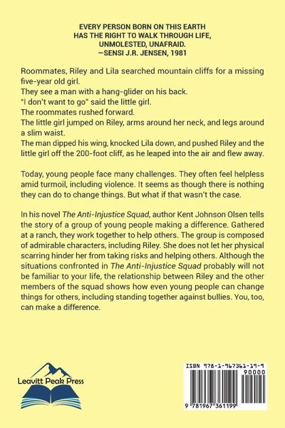 EVERY PERSON BORN ON THIS EARTH HAS THE RIGHT TO WALK THROUGH LIFE, UNMOLESTED, UNAFRAID. SENSI J.R. JENSEN, 1981 Roommates, Riley and Lila searched mountain cliffs for a missing five-year old girl. They see a man with a hang-glider on his back. I don't want to go said the little girl. The roommates rushed forward. The little girl jumped on Riley, arms around her neck, and legs around a slim waist. The man dipped his wing, knocked Lila down, and pushed Riley and the little girl off the 200-foot cliff, as he leaped into the air and flew away. Today, young people face many challenges. They often feel helpless amid turmoil, including violence. It seems as though there is nothing they can do to change things. But what if that wasn't the case.