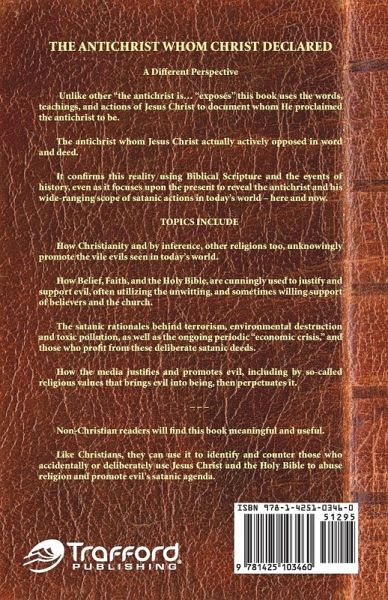 THE ANTICHRIST WHOM CHRIST DECLARED A Different Perspective Unlike other "the antichrist is… "exposés" this book uses the words, teachings, and actions of Jesus Christ to document whom He proclaimed the antichrist to be. The antichrist whom Jesus Christ actually actively opposed in word and deed. It confirms this reality using Biblical Scripture and the events of history, even as it focuses upon the present to reveal the antichrist and his wide-ranging scope of satanic actions in today’s world – here and now. TOPICS INCLUDE How Christianity and by inference, other religions too, unknowingly promote the vile evils seen in today’s world. How Belief, Faith, and the Holy Bible, are cunningly used to justify and support evil, often utilizing the unwitting, and sometimes willing support of believers and the church. The satanic rationales behind terrorism, environmental destruction and toxic pollution, as well as the ongoing periodic "economic crisis," and those who profit from these deliberate satanic deeds. How the media justifies and promotes evil, including by so-called religious values that brings evil into being, then perpetuates it. – – – Non-Christian readers will find this book meaningful and useful. Like Christians, they can use it to identify and counter those who accidentally or deliberately use Jesus Christ and the Holy Bible to abuse religion and promote evil’s satanic agenda.