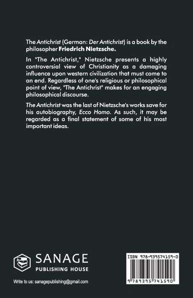 The Antichrist (German: Der Antichrist) is a book by the philosopher Friedrich Nietzsche. In ""The Antichrist,"" Nietzsche presents a highly controversial view of Christianity as a damaging influence upon western civilization that must come to an end. Regardless of one's religious or philosophical point of view, ""The Antichrist"" makes for an engaging philosophical discourse. The Antichrist was the last of Nietzsche's works save for his autobiography, Ecco Homo. As such, it may be regarded as a final statement of some of his most important ideas.