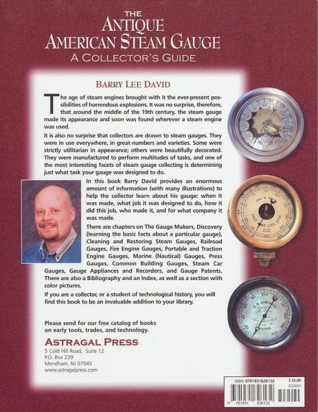 The age of steam engines brought with it the ever-present possibilities of horrendous explosions. It was no surprise, then, that around the middle of the 19th century, the steam gauge made its appearance and soon was found wherever a steam engine was used. Steam gauges were used everywhere, in great numbers and varieties. Some were strictly utilitarian in appearance; others were beautiful decorated. They were manufactured to perform multitudes of tasks, and one of the most interesting facets of steam gauge collecting is determining just what task your gauge was designed to do. Author Barry David provides an enormous amount of information in this book that helps the collector learn about his gauge: when it was made, what job it was designed to do, how it did this job, who made it, and for what company it was made. There are chapters on The Gauge Makers, Discovery (learning the basic facts about a particular gauge), Cleaning and Restoring Steam Gauges, Railroad Gauges, Fire Engine Gauges, Portable and Traction Engine Gauges, Marine (Nautical ) Gauges, Press Gauges, Gauge Appliances and Recorders, and Gauge Patents. There is also a section with color pictures as well as a Bibliography and Index. If you are a collector, or a student of technological history, you will find this book to be an invaluable addition to your library.