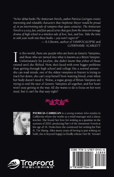 "In her debut books The Antiserum Novels, author Patricia Carrigan creates interesting and relatable characters that Stephenie Meyer would be proud of, in an intertwining tale of vampires that spans centuries. The Antiserum Novels is a sexy, fun, and fast-paced series that goes from the innocent teenage drama of high school to a timeless tale of love, lust, and loss. Take the time to sink your teeth into these books - you won't regret it!" - E.S.Brown, author of VAMPOCALYPSE and CODENAME: SCARLETT In this world, there are people who are born as Genetic Vampires, and those who are turned into what is known as a Bitten Vampire. Unfortunately for Jocelyn, she didn't know that either of those existed until she Shifted. Now, she's faced with even bigger problems than getting through high school and college like a normal person - she can read minds, one of the oldest vampires in history is trying to track her down, she can't stop herself from wanting blood, even when her body doesn't need it. Worse, a rogue group of Bitten Vampires are trying to end the race of Genetic Vampires all together, and her heart won't stop getting in the way. All she wants to do is focus on her next meal, but it can't be that easy right?