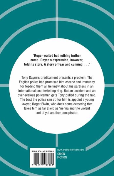 'Roger waited but nothing further came. Dayne's expression, however, told its story. A story of fear and cunning ...' Tony Dayne's predicament presents a problem. The English police had promised him escape and immunity for feeding them all he knew about his partners in an international counterfeiting ring. But an accident and an over-zealous policeman gets Tony pulled during the raid. The best the police can do for him is appoint a young lawyer, Roger Elwin, who does some detecting that takes him as far afield as Vienna and the violent end of yet another conspirator.