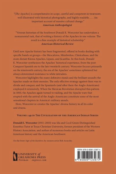 Until now Apache history has been fragmented, offered in books dealing with specific bands or groups-the Mescaleros, Mimbreños, Chiricahuas, and the more distant Kiowa Apaches, Lipans, and Jicarillas. In this book, Donald E. Worcester synthesizes the total historical experience of the Apaches, from the post-Conquest Spanish era to the late twentieth century. In clear, fluent prose he focuses primarily on the nineteenth century, the era of the Apaches' sometimes splintered but always determined resistance to the white intruders. They were never a numerous tribe, but, in their daring and skill as commando-like raiders, they well deserved the name ""Eagles of the Southwest."" The book highlights the many defensive stands and the brilliant assaults the Apaches made on their enemies. The only effective strategy against them was to divide and conquer, and the Spaniards (and after them the Anglo-Americans) employed it extensively, using renegade Indians as scouts, feeding traveling bands, and trading with them at their presidios and missions. When the Mexican Revolution disrupted this pattern in 1810, the Apaches again turned to raiding, and the Apache wars that erupted with the arrival of the Anglo-Americans constitute some of the most sensational chapters in America's military annals. The author describes the Apaches' life today on the Arizona and New Mexico reservations, where they manage to preserve some of the traditional ceremonies, while trying to provide livelihoods for all their people. The Apaches still have a proud history in their struggles against overwhelming odds of numbers and weaponry. Worcester here re-creates that history in all its color and drama.