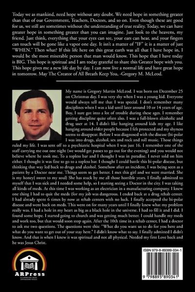 Today we, as mankind, need hope without any doubt. We need hope in something greater than that of our Government, Teachers, Doctors, and so on. Even though these are good for us, we still are sometimes without the understanding of true reality. Today, we can have greater hope in something greater than you can imagine. Just look to the heavens, my friend. Just think, everything that your eyes can see, your ears can hear, and your fingers can touch will be gone like a vapor one day. It isn't a matter of "IF" it is a matter of just "WHEN." Then what? If this life here on this great earth was all that I have hope in, I would be the most miserable person that man would know. This hope that I have today is BIG. This hope is spiritual and I am today grateful to share this Greater hope with you. This hope gives me a new life day by day. I can now live a normal life and have great hope in tomorrow. May The Creator of All Breath Keep You,-Gregory M. McLeod.