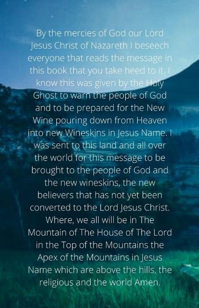 By the mercies of God our Lord Jesus Christ of Nazareth I beseech everyone that reads the message in this book that you take heed to it. I know this was given by the Holy Ghost to warn the people of God and to be prepared for the New Wine pouring down from Heaven into new Wineskins in Jesus Name, The Mountain Of The House Of The Lord In the Top (Apex) Of The Mountains above the hills. New Wine cannot be poured out into old wineskins for New Wineskins are required with the separation of tare churches and wheat churches until they will be gathered together and separated by the Lord Jesus Christ at judgement!