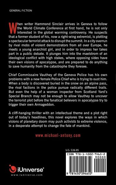 When writer Hammond Sinclair arrives in Geneva to follow the World Climate Conference at first hand, he is not only interested in the global warming controversy. He suspects that a former student of his, now a right-wing extremist, is plotting a spectacular terrorist attack to disrupt the summit. In a city overrun by rival mobs of violent demonstrators from all over Europe, he meets a young anarchist girl, and in order to impress her takes part in a public debate. It plunges him into the maelstrom of an ideological conflict with high stakes, where opposing sides have their own visions of apocalypse, and are prepared to do anything to save humanity from the catastrophe they foresee. Chief Commissaire Vauthey of the Geneva Police has his own problems with a new female Police Chief who is trying to oust him. When a body is discovered buried in the snow on an alpine pass, the rival factions in the police pursue radically different trails. But even the help of a woman inspector from Scotland Yard's Special Branch may not be enough to allow Vauthey to uncover the terrorist plot before the fanatical believers in apocalypse try to trigger their own Armageddon. A cliff-hanging thriller with an intellectual theme and a plot right out of today's headlines, this novel explores the ways in which visions of planetary doom may push activists to extreme violence, in a desperate attempt to change the fate of mankind. www.michael-antony.com