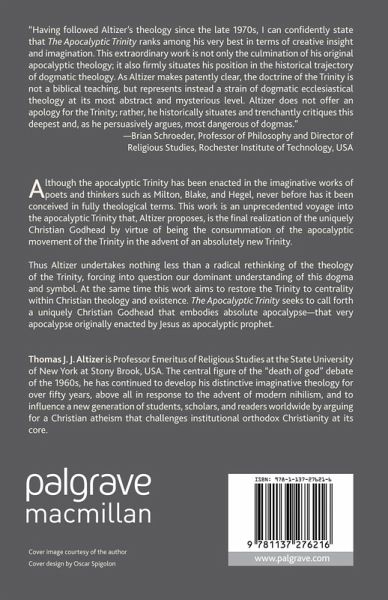 "Having followed Altizer's theology since the late 1970s, I can confidently state that The Apocalyptic Trinity ranks among his very best in terms of erudition, insight, and imagination. This extraordinary work is not only the culmination of his original apocalyptic theology; it also firmly situates his position in the historical trajectory of dogmatic theology. As Altizer makes patently clear, the doctrine of the Trinity is not a biblical teaching, but represents instead a strain of dogmatic ecclesiastical theology at its most abstract and mysterious level. Altizer does not offer an apology for the Trinity; rather, he historically situates and trenchantly critiques this deepest and, as he persuasively argues, most dangerous of dogmas." - Brian Schroeder, Professor of Philosophy and Director of Religious Studies, Rochester Institute of Technology