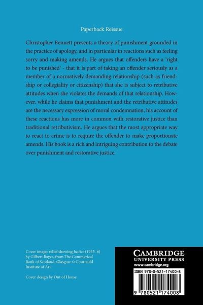 Christopher Bennett presents a theory of punishment grounded in the practice of apology, and in particular in reactions such as feeling sorry and making amends. He argues that offenders have a 'right to be punished' - that it is part of taking an offender seriously as a member of a normatively demanding relationship (such as friendship or collegiality or citizenship) that she is subject to retributive attitudes when she violates the demands of that relationship. However, while he claims that punishment and the retributive attitudes are the necessary expression of moral condemnation, his account of these reactions has more in common with restorative justice than traditional retributivism. He argues that the most appropriate way to react to crime is to require the offender to make proportionate amends. His book is a rich and intriguing contribution to the debate over punishment and restorative justice.