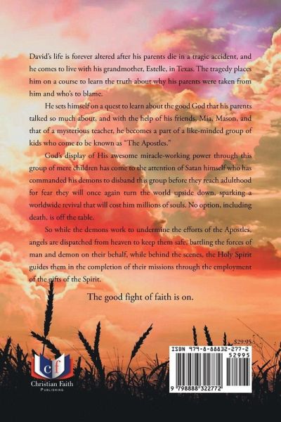 David's life is forever altered after his parents die in a tragic accident, and he comes to live with his grandmother, Estelle, in Texas. The tragedy places him on a course to learn the truth about why his parents were taken from him and who's to blame. He sets himself on a quest to learn about the good God that his parents talked so much about, and with the help of his friends, Mia, Mason, and that of a mysterious teacher, he becomes a part of a like-minded group of kids who come to be known as "The Apostles." God's display of His awesome miracle-working power through this group of mere children has come to the attention of Satan himself who has commanded his demons to disband this group before they reach adulthood for fear they will once again turn the world upside down, sparking a worldwide revival that will cost him millions of souls. No option, including death, is off the table. So while the demons work to undermine the efforts of the Apostles, angels are dispatched from heaven to keep them safe, battling the forces of man and demon on their behalf, while behind the scenes, the Holy Spirit guides them in the completion of their missions through the employment of the gifts of the Spirit. The good fight of faith is on.