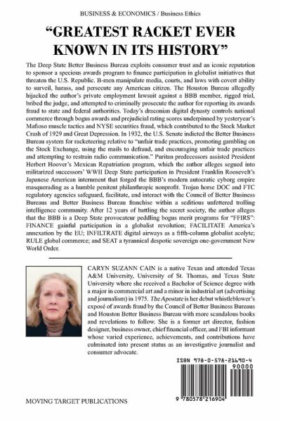 The Apostate is a whistleblower's account of the Deep State Better Business Bureau's awards racket that funds a covert seditious anti-American new world order agenda. The author alleges that the Council of Better Business Bureaus (CBBB) launched a specious integrity awards program in the year 2000 to overcome the BBB franchise's stagnant growth and organizational insolvency, which resulted in marketplace sovereignty and globalist conquest. BBB awards were designed to promote members, disparage nonmember competition, and support the CBBB through awards-gotten revenue money-laundered as "bureau dues." Consumers are exploited and hoodwinked by phony BBB awards; the public is not told that awards are not evaluated and based on an honor code. In fact, awards are distributed to only members and won through best answers to applications' ethics' questions; and there is no on-site verification process to validate members' responses. The BBB's awards program is a successors' remix of predecessors' Prohibition-era "Before You Invest, Investigate" securities program that contributed to the Stock Market Crash of 1929. During the Roaring Twenties, the NYSE filtered "$50,000,000,000" billion dollars in worthless securities through the New York Bureau's bogus investigative program. In 1932, U.S. Senator Duncan Upshaw Fletcher (D-FL), later Chairman of the Committee on Banking and Currency (Pecora Commission), indicted the Better Business Bureau, NYSE, and Investment Banker's Association "as the greatest racket ever known in its history." The author won several BBB awards for her former employer. After winning the most coveted Pinnacle award in 2008, the con artist employer entrapped the author in consumer fraud. The author reported the employer to the CBBB and Houston Better Business Bureau, but was vilified, targeted, and persecuted. The employer was sued by the author for employment-related claims, but the Houston Bureau allegedly hijacked her private lawsuit, fabricated felonious charges, and bribed the District Court judge. B-men attempted to imprison the author to bury her damning testimony and evidence that threatened to ruin the BBB's pristine scam buster image and awards' cash cow. And the Houston Bureau manipulated court strings delaying the author's trial while rigging another trial's verdict involving defamation to use against the author. After procuring a favorable ruling, the Houston Bureau immediately green-lit the author's trial and segued its attorney into legal proceedings to fabricate counterclaims of slander, breach of fiduciary duties, and conversion/theft. The Apostate reveals FDR's indoctrination of the Better Business Bureau into the Deep State in 1941, whose Truman-inspired footprints begat the CIA. Today, the Bureau is an autonomous nation state that hides its militarized operations behind a humble philanthropic nonprofit facade. The BBB's draconian digital dynasty connects to the European Union, which is currently seeding oppressive Sharia blasphemy laws throughout the world, including the United States and social media. Accordingly, the author suffered cybercrime and sabotage for years until publication. Caveat emptor has returned, and consumers must beware! The BBB is an imposter consumer advocate promoting fake monopolizing nefarious awards to finance globalist aspirations seeking to replace the U.S. Republic with a one-government NWO.