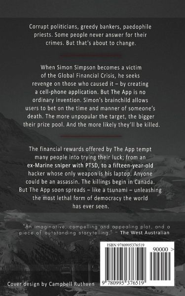 Corrupt politicians, greedy bankers, paedophile priests. Some people never answer for their crimes. But that's about to change. When Simon Simpson becomes a victim of the Global Financial Crisis, he seeks revenge on those who caused it - by creating a cell-phone application. But The App is no ordinary invention. Simon's brainchild allows users to bet on the time and manner of someone's death. The more unpopular the target, the bigger their prize pool. And the more likely they'll be killed. The financial rewards offered by The App tempt many people into trying their luck; from an ex-Marine sniper with PTSD, to a fifteen-year-old hacker whose only weapon is his laptop. Anyone could be an assassin. The killings begin in Canada. But The App soon spreads - like a tsunami - unleashing the most lethal form of democracy the world has ever seen.