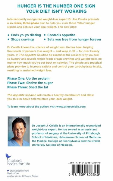 The Appetite Solution is weight loss expert Dr Joseph J. Colella's aggressive six-week, three-phase plan to help you jam 'false' hunger signals, diminish cravings and achieve your goal weight - breaking free of the carbohydrate addiction that packed on those difficult-to-shed pounds. Dr Colella examines the reasons why we feel so hungry and dismisses the diet myths that have recently been endorsed. He reveals how the 'sugar free', 'juice' and 'alkaline' diets that supposedly promote weight loss are actually loaded with hidden simple sugars that create cravings and lead to over eating. Instead, Colella proves to readers that the key to permanent weight loss is eating complex sugars and the right amount of protein. He introduces a simple and practical three stage plan that increases satiety and curbs your carbohydrate intake resulting in sustained weight loss: Phase One: Up the protein Phase Two: Lower Simple Sugars and begin moderate resistance exercise Phase Three: Shed the Fat The Appetite Solution launches you on a journey that is forever free from an excessive appetite, creating a healthy metabolism and bringing your weight under control permanently.