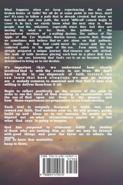 What happens when we keep experiencing the dry and broken bones of faith? We all do at some point in our lives, don't we? It's easy to follow a path that is already created, but when we have to make our own path, the word "difficult" cannot begin to cover it. In fact, we rarely know what the next step is. Most people fear the unknown, especially when they feel they are moving in, what is for them, the pathway of the uncharted territory of a waiting destiny. The author of The Apple of His Eye Mentality, Marion Green, asserts that, though we sometimes may believe that we are alone on that pathway, the reality is that God could never be closer and has us centered safely in the apple of His eye. Even more, He has already prepared a unique journey that ensures our safe arrival. The walk of faith involves placing each foot in a place that God, not we, can see...knowing that God's eye is on us because He has determined to bring us to our destiny. Recent events in the history of the world have caused a strong renewed interest in the spiritual realm. Many people no longer want to live a sedentary life of work, home, and church. They want more and they instinctively understand that they were built, body, soul, and spirit, to be more, just as an eagle is not content to walk on the ground day after day, but can only be completely free as it was made to be - soaring on the lofty heights of the air above. It's natural; most people instinctively fight against disappearing into the gray pit of the mundane and being bound by the natural pull of gravity. So many people want to invest more in themselves than what they see with the natural eye. They want to walk in the same victories that they read about in the bible. They want to know that He is truly the God who sees them, and answers them in their call and uncertainty. They assurance that God has more than a passing interest in taking them to the highest heights and will be there from the start of their faith-walk to the finish of their destiny. In the same way that people have trended more toward social media to assist them with making the best natural decisions, believers want access to quicker, simpler, believer-friendly relevant information to walking in their destiny under the loving, watchful eyes of God. The Apple of His Eye Mentality delivers the same ability to connect them with what theyare searching for on a spiritual level. This book equips them to make healthier spiritual decisions that positively influence their destiny. The results are changes in the believers' mentality that help them realize that their dreams and destiny are within reach and possible to achieve, and that help them foster a stronger connection to God, their family and community. READER BENEFITS We learn to move out of impartial head knowledge into the intimate heart knowledge that God is closely involved in the events in our lives because of His passionate love for humanity on an individual basis. We don't have to die in our shipwreck of faith. God will bless us through unusually frightening and confounding circumstances which seem meant to destroy us, but are actually detours to outcomes meant to bless us and others through us. Troubles or persecutions that we may go through are a malady common to mankind and that God is able and willing to deliver them from it all. Reflect positively on the events of their past in order to see the hand of God working in coordination with the eye of God upon our lives in the present, and how those experiences are preparatory to our future destiny. Each trial is uniquely designed to build, test, and reward our faith. God watches over us, He will protect, guide, build up and bless. We will depend no more on what circumstances appear to be, but what God says is going to happen. God has purposed t