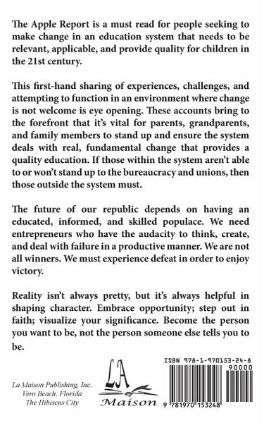 The Apple Report is a must read for people seeking to make change in an education system that needs to be relevant, applicable, and provide quality for children in the 21st century. This first-hand sharing of experiences, challenges, and attempting to function in an environment where change is not welcome is eye opening. These accounts bring to the forefront that it's vital for parents, grandparents, and family members to stand up and ensure the system deals with real, fundamental change that provides a quality education. If those within the system aren't able to or won't stand up to the bureaucracy and unions, then those outside the system must. The future of our republic depends on having an educated, informed, and skilled populace. We need entrepreneurs who have the audacity to think, create, and deal with failure in a productive manner. We are not all winners. We must experience defeat in order to enjoy victory. Reality isn't always pretty, but it's always helpful in shaping character. Embrace opportunity; step out in faith; visualize your significance. Become the person you want to be, not the person someone else tells you to be.