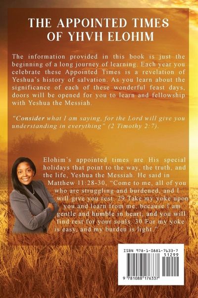 The information provided in this book is just the beginning of a long journey of learning. Each year you celebrate these Appointed Times is a revelation of Yeshua's history of salvation. As you learn about the significance of each of these wonderful feast days, doors will be opened for you to learn and fellowship with Yeshua the Messiah. "Consider what I am saying, for the Lord will give you understanding in everything" (2 Timothy 2:7). Elohim's appointed times are His special holidays that point to the way, the truth, and the life, Yeshua the Messiah. He said in Matthew 11:28-30, "Come to me, all of you who are struggling and burdened, and I will give you rest. 29 Take my yoke upon you and learn from me, because I am gentle and humble in heart, and you will find rest for your souls. 30 For my yoke is easy, and my burden is light."