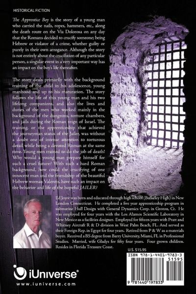 The Apprentice Boy is the story of a young man who carried the nails, ropes, hammers, etc., along the death route on the Via Dolorosa on any day that the Romans decided to crucify someone; being Hebrew or violator of a crime, whether guilty or purely in their own arrogance. Although the story is not entirely about the crucifixion of any particular person, a singular event in a very important way has an impact on the boy's life thereafter. The story deals primarily with the background training of the child in his adolescence, young manhood and up to his maturation. The story follows the life of this young man and his two lifelong companions, and also the lives and duties of the men who worked mainly in the background of the dungeons, torture chambers, and jails during the Roman reign of Israel. The training, or the apprenticeship that achieved the journeyman status of the Jailer, was without a doubt one of intense attention to torturous detail while being a devoted Roman at the same time. Young men trained to do the job of death! Why would a young man prepare himself for such a cruel future? With such a hard Roman background, how could the crucifying of one innocent man and the friendship of the beautiful Hebrew woman Valentis, have such an impact on the behavior and life of the hopeful JAILER?